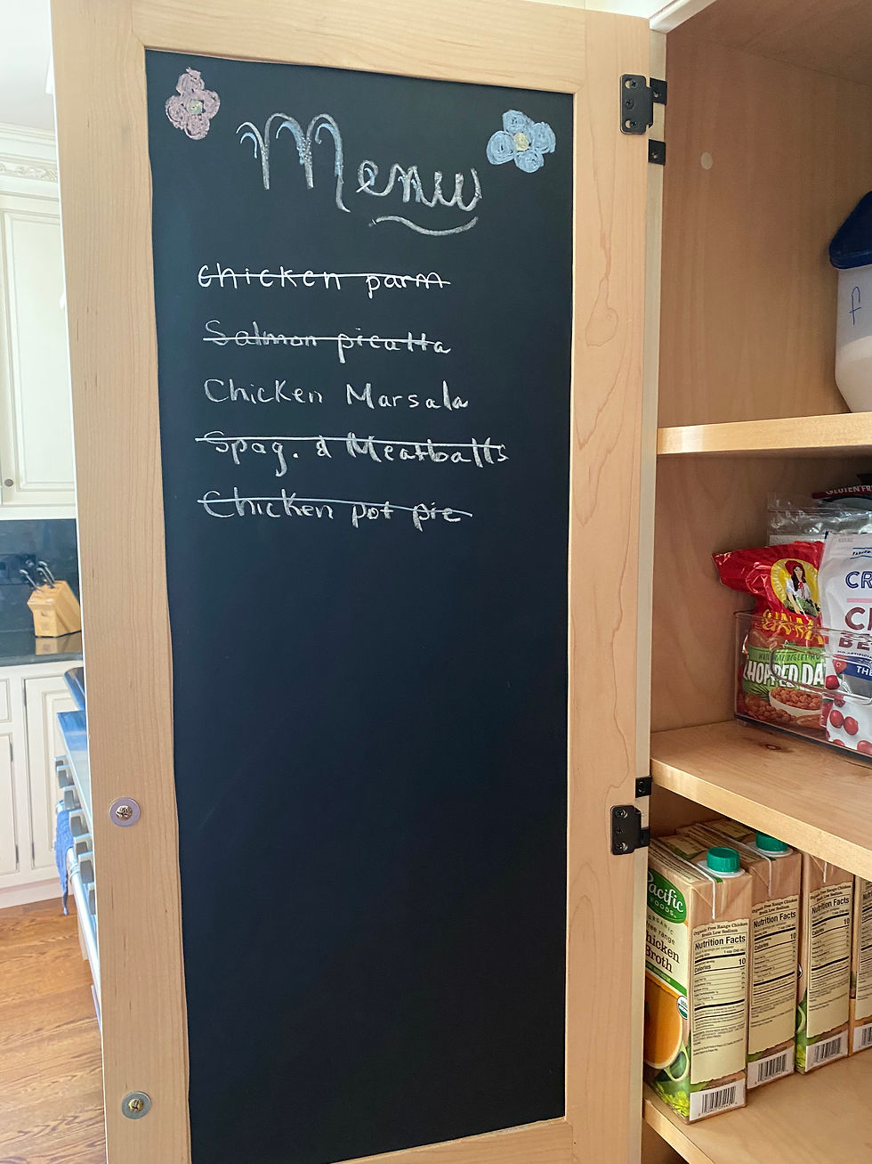 I had also added a cool new concept of blackboard contact paper to the inside top portion of the pantry to be able to write notes. On the left is our "Menu" for dinners and on the right is the place for family to write what items are needed from the grocery store. The addition of the "chalkboards" has helped us as a family have more understanding of our day to day kitchen health.
